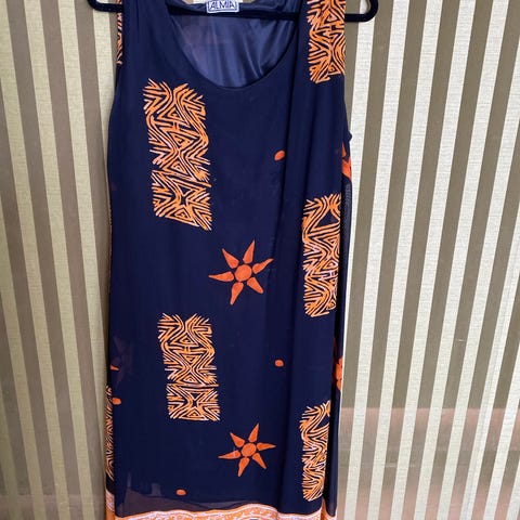 Nydelig kjole med fine detaljer. Underkjole følger med. Lengde ca 100 cm. Maximal overvidde rundt brystet 120 cm., men grunnet fasongen faller fint og passer str L/XL