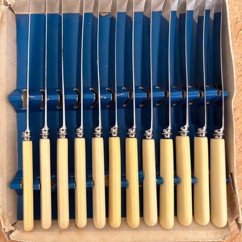 11 stk fruktkniver fra Atkinson Bros Sheffield. Rustfrie. Lengde ca 17 cm. Hele og pene. Den ene kniven har noe rust. Pris samlet.