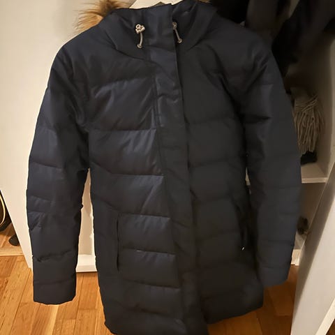 Parkas gis bort. Den er godt brukt de siste vintrene, men er fortsatt helt fin. Man kan se av det hvite partiet på innsiden at den er brukt.