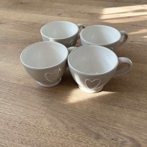 Hjemmelaget stettfat av gamle asjetter i hvitt/beige og gull.