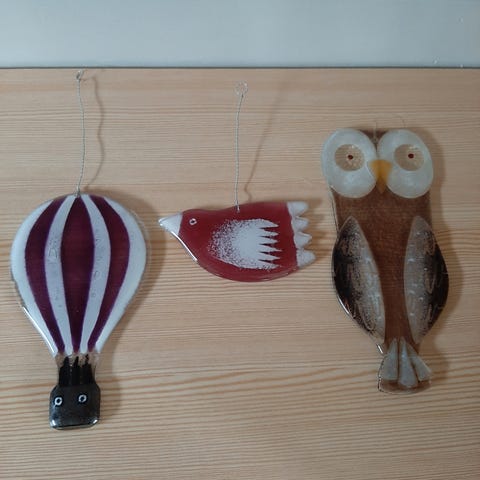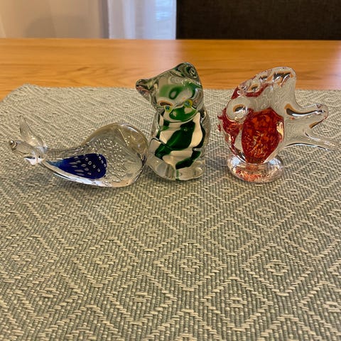 En liten samling med glass dyrefigurer. Alle er hele og pene, men dessverre er de fleste merkelappene blitt fjernet. Selges enkeltvis (fra kr 90,- til kr 125,-) eller samlet for kr 400,-.