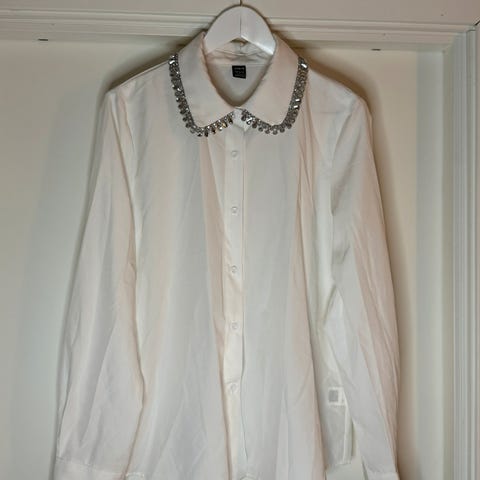 Jeg selger en hvit, litt gjennomsiktig bluse. Størrelse XS. Tilstanden er veldig god.
