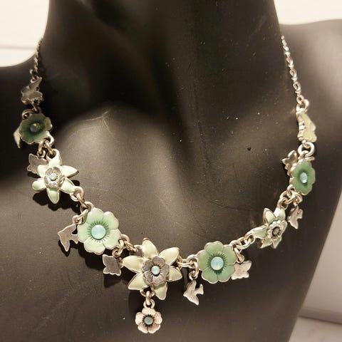 Søkeord; smykke kjede halskjede blomst pilgrim dansk design blomster farger gul hvit blå grønn hvit flower bursdag selskap