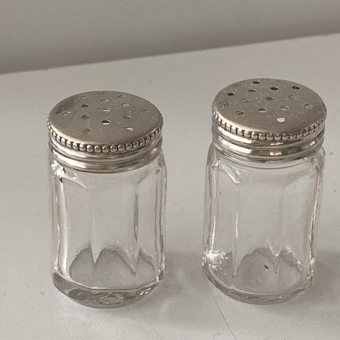 830S Salt- og pepperkar i sølv med glassinnsats og teskje