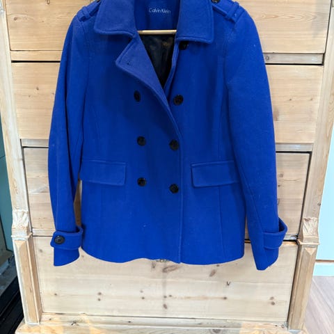 Kongeblå / koboltblå kort kåpe i viskoseblanding (se siste bilde) str. 42. Litt stretch i stoffet. Like nydelig vår som høst. Fargen er årets trendfarge iflg. Chanel, Veline og Versace m.fl., jf. Dagens Næringsliv 21. januar. Aldri brukt (!) pga feil størrelse! (Kunne derfor vært annonsert som ny.) Har derfor hengt i et skap og fortjener å bli brukt. Fra merket Sara Kelly (Ellos). Ekstra knapp henger på.