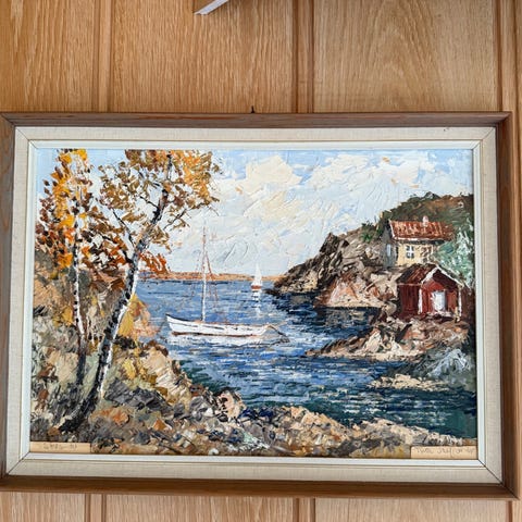 Oljemaleri på plate av Signy Willums (1879-1959). Trivelig og sommerlig motiv fra Slagen i Tønsberg, malt 1929. Signert, datert og stedfestet. Det har tidligere vært oppbevart fuktig, platen er bulkete. Eldre ramme. Rammen måler ca 42x33 cm.