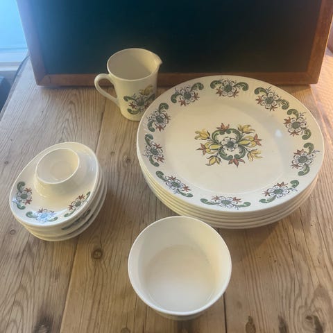 Diameter på asjetten: 21 cm. Høyden på koppen: 9 cm. Disse flotte fargene er jo til å bli i godt humør av. Helt feilfri. Selges samlet