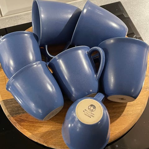 Fem blå Höganäs kopper