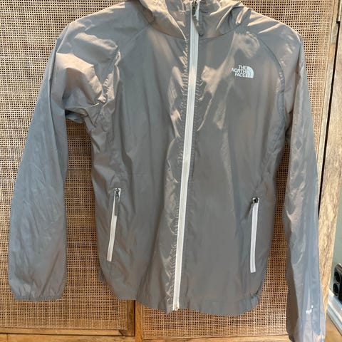 Tynn og lett vindjakke til junior fra The North face. Fin til både trening og fritid. Er vannavvisende. To lommer med glidelås og hette. Meget pent brukt.