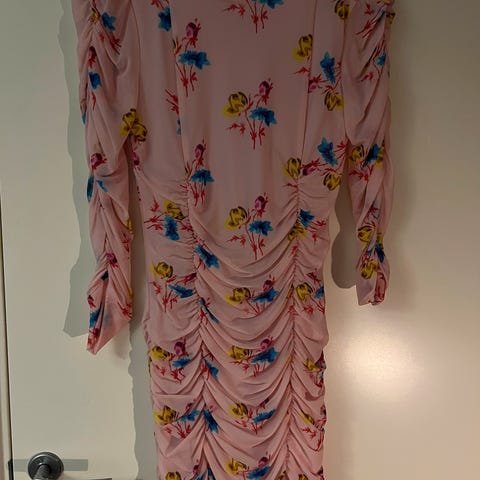 Pent brukt omslagskjole fra Ganni som er fin å bruke året rundt med strømpebukser og genser under på vinteren. Se siste bildet. Passer alt fra xs-m da den justeres med knyting i livet