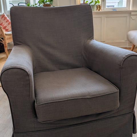 en grå lenestol i god stand. Den er komfortabel med avtagbart trekk som kan vaskes. Perfekt for stue, gang eller soverom.