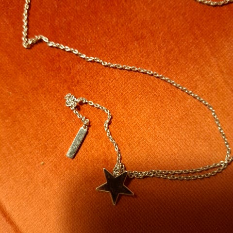 Givenchy vintage stjerne smykke fra 1979 med merking navn årstall bak. Det er gullbelagt og platina eller sølv i tuppene rundt stener i små krystaller. Ca cm mål: 3,5 x 2,5 kjede er ca 40 langt.