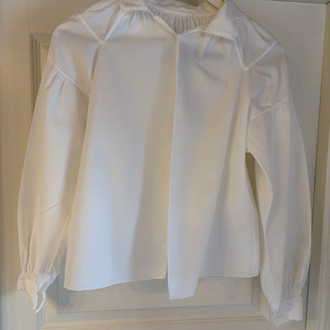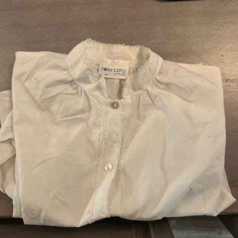Lin og bomull bunad skjorte til barn. Lende 43 cm bredde 43 cm arm fra halse nedover 55 cm. Jeg tror passer til 6- 7 år. Har en flekke i venstre arm. Se bilde. Passer til barna 10/12 år. Størrelse XS.