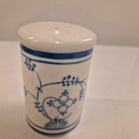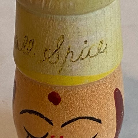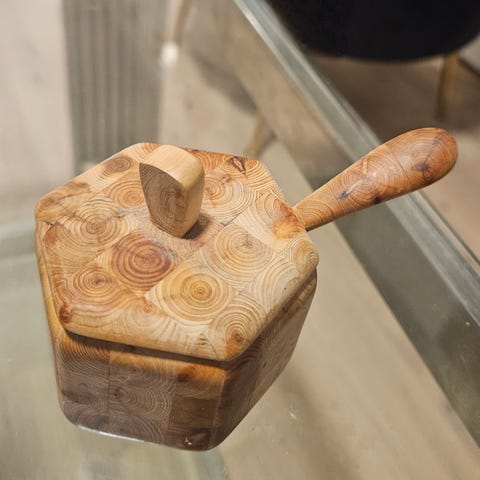 Bøsse til krydder. Keramisk topp og treverk som kropp. Varmt treverket.