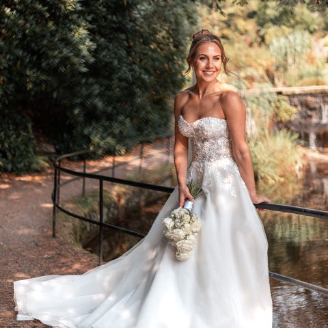 Brudekjole med blonder, merke Grahame. Jeg er 167 ,gikk med flate sko.