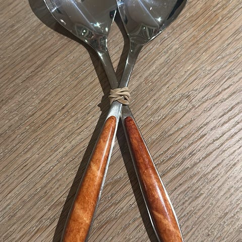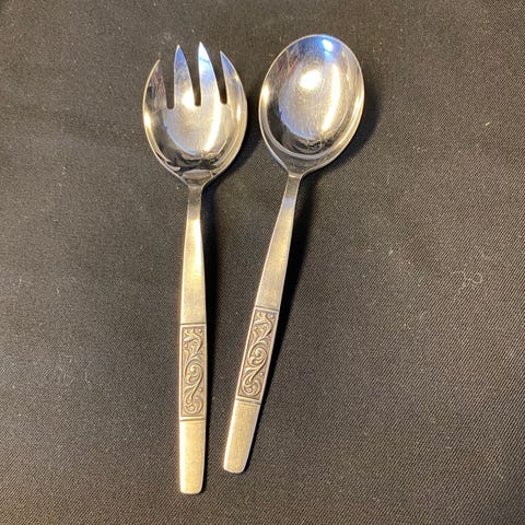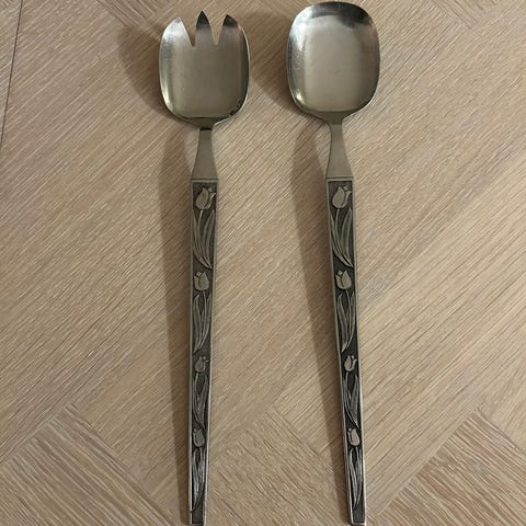 Rustfritt stål, tulipanmønster, litt slitasje.