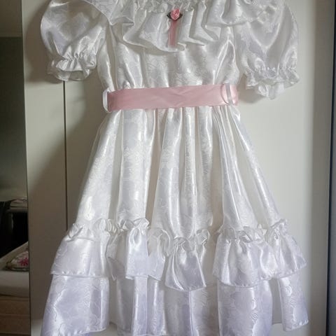 Til salgs en gang brukt første nattverd kjole str 128 Jeg selger det kjole med tilbehør som er på bilder. Skoene str 32