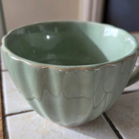 27 cm i diameter, 11 cm høyt. Liten feil der stetten er festet til fatet. Skjønnhetsfeil som ikke har noe å si for bruken. Hentes eller sendes mot porto betalt av kjøper.