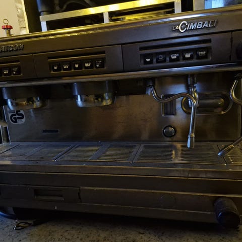 Proff Italiensk espresso/kaffemaskin med tilhørende utstyr. Noen av delene ble byttet i 2018. Maskinen fungerer godt.