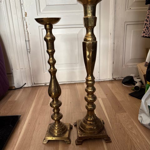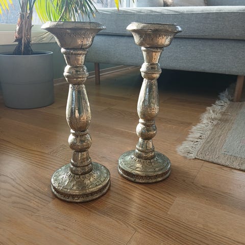 2 store lysestaker i patinert gullfarget metall til salgs.