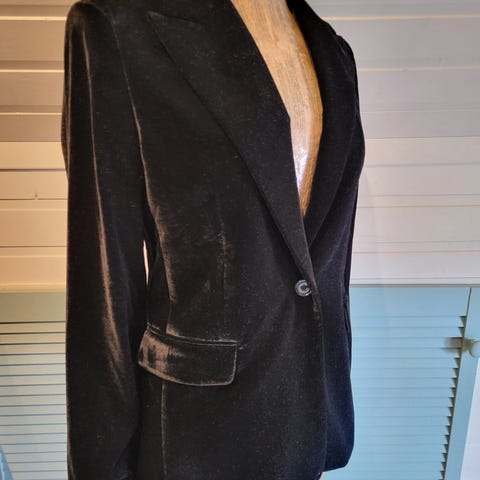 Lekker sort fløyels blazer fra Gerry Weber. 78% bomull, 21% modal, 1% elasthan. Lukkes med 3 sorte knapper med en sten i - 3 knapper nede på ermet. 2 lomme med klaff. Jakken er lett svinget med skulderputer.