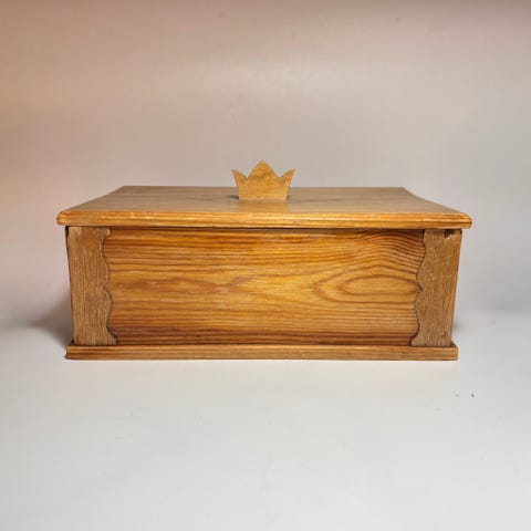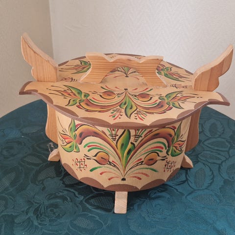 Koselig gammelt skrin/løvsagarbeid fôret med stoff, laget på 50/60-tallet. Stoffet inni er veldig tynnslitt og har noen hull, se bilder.