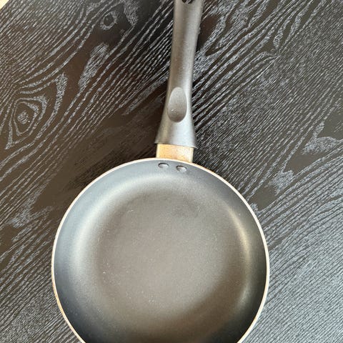 Espegard stekepanne, rød med svart innvendig emalje. Den er såvidt brukt, og har ingen synlig bruksmerker utenom et hakk i emaljen på undersiden av håndtaket. Se eget bilde.