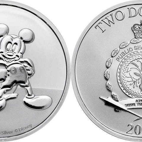 Forsiden av mynten har det offisielle Disney100-emblemet som markerer 100 år med eventyr og underholdning. Baksiden viser en flott silhuett av Mikke Mus med tryllestav, et symbol på Disneys evige magi.