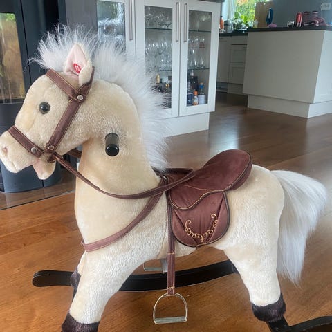 Veldig fin gyngehest med melodi/musikk (ved å trykke på ørene). Virker som den skal.