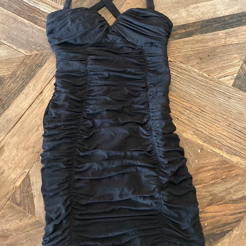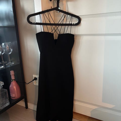 Lekker, sort og sølv selskapskjole med dyp V utringning foran og bak. Veldig komfortabel.