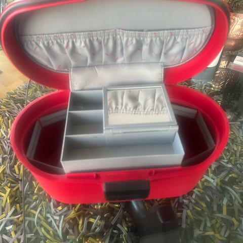 Pent brukt beautybag selges, disse var veldig moderne når jeg kjøpte denne. Jeg kan vel si at den er pent brukt, men desverre så ble speilen knust en gang den falt ned. Men den er pen inni og jeg har vasket lommen. Den egner seg best for bagasje i bil. Hvis noen er interressert kan de få den rimelig, her kan du få med deg alt av kosmetikk, og hva du trenger, 200 el bud.