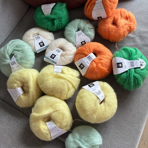 9 nøster originalgarn Pickles Big Fuzz, nok til alle størrelser. Noen av fargene er ikke lengre i Pickles sortiment.
