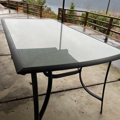Hagebord i metall og glass. Noen riper, som kan sees på bildet, ellers i fin stand.