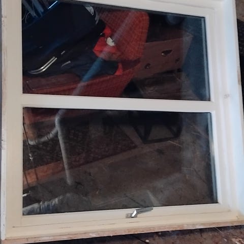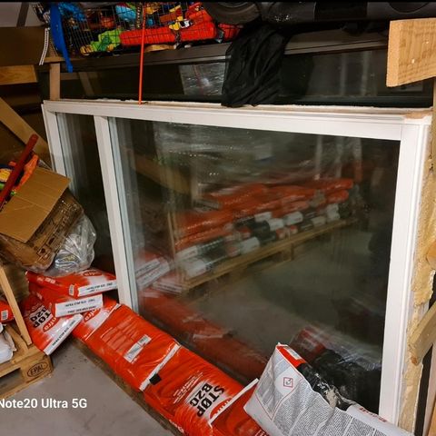 Vindu til hagestue etc.0,95 m høyt og 2 m bredt.5 mm herdet glass.lakkert aluminiumsramme.