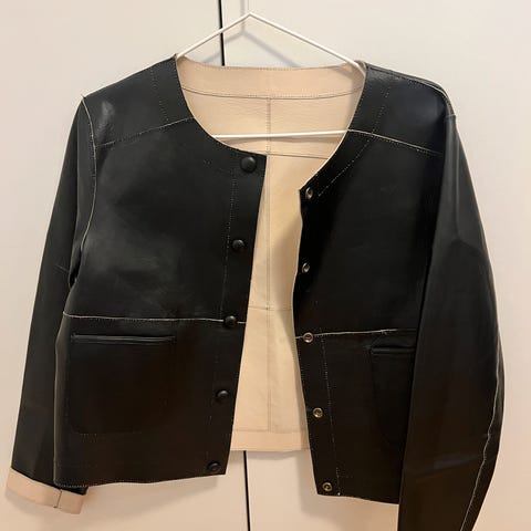 Jakken lukkes med glidelås og har to lommer m/glidelås. Den har stikninger foran, bak og på ermene. Lite brukt og ingen bruksmerker. Litt liten i str., så passer best en str.38.