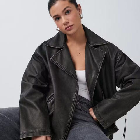 Skikkelig kul jakke fra Pull & Bear i imitert skinn. Kjøpt spontant på ferie, men passet meg dessverre ikke helt. Aldri brukt, men lapper er klippet av. Cropped i stilen, måler ca. 40 cm fra nakke og ned. Fortsatt i salg.