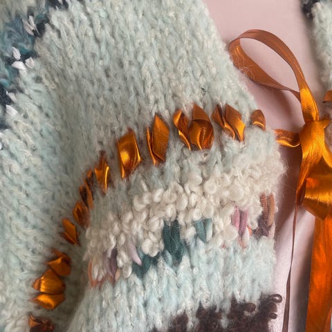 Jeg har fått den strikket på bestilling, og den er strikket med Per Gynt garn, og et garn i mohaiblanding