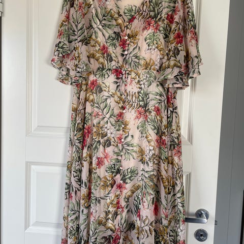 Cream sommerkjole i størrelse M med flerfarget mønster. Kjolen har et lett og luftigt design, egnet for varme dager.