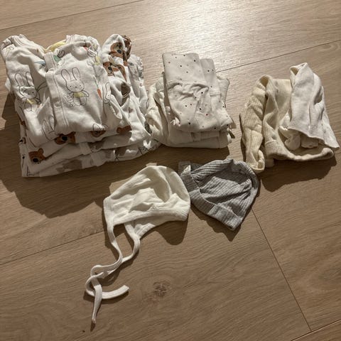 Selger en liten klespakke i strl 56. Fire bodyer og to pysjer.