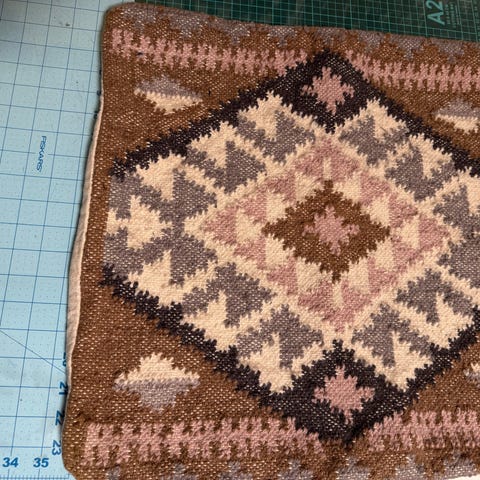 Husflid / Håndvevd. Bunnfargen er lys grå.