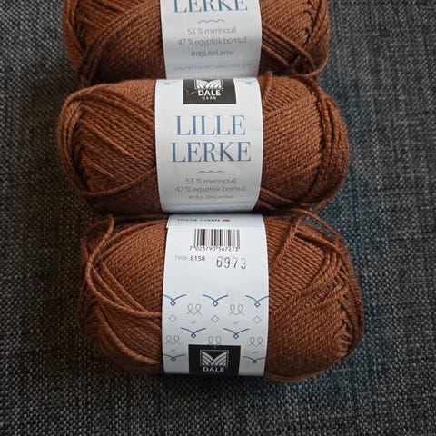 14 nøster Dale Lerke i fargen 8156 espresso selges for 400 kr samlet eller 30 kr per nøste 😊