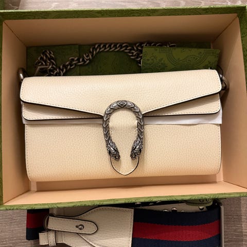 Selger den nydelige Gucci marmont vesken med tungt hjerte nårsom den ikke blir brukt som den fortjener. Den fine krem fargen fins ikke lenger .. ingen bruksmerker ..nesten helt ny.. kan brukes på fest og i hverdag hvis ønskelig .. ligget i dustbag og boks hele tiden .. kjøpt i Oslo Gucci butikken .. følger med alt ..