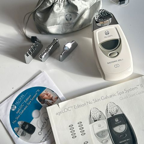 Etui, Galvanic Spa II apparat, ansikts elektrode, elektrode for fokusområder, kroppselektrode, hodebunnselektrode, to esker Facial Gels ( kun brukt én), tube med Tru face line corrector. Apparatet er brukt kun to ganger. Har stått på badet og fått lyseksponering. Derfor litt gulaktig.