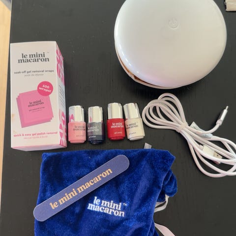Gelmanikyr sett fra Le Mini Macarons selges. Settet er kun brukt en gang, da min karriere som egen negldesigner ble kortvarig, grunnet manglende tålmodighet og fraværende talent. Selger også fire neglelakk kjøpt i tillegg og ekstra removal pads. Det fulgte med en neglefil i settet, men den medfølger ikke.
