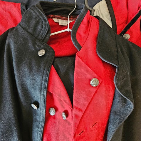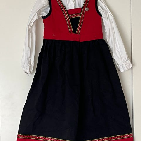 Festdrakt til jente i str 4 år. Pent brukt, men skjorten mangler en mansjettknapp på høyre erme. Det er også noen flekker på forkledet, som antas å kunne fjernes med en liten innsats :) Praktisk åpning/lukking med borrelås i livet som gjør at stakken passer lenge.