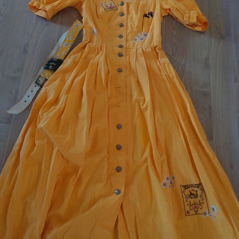 Skjørt med broderte detaljer i ull, vest med broderte detaljer i ull, skjorte med broderte detaljer i bomull, kortermet blazer i bomull.