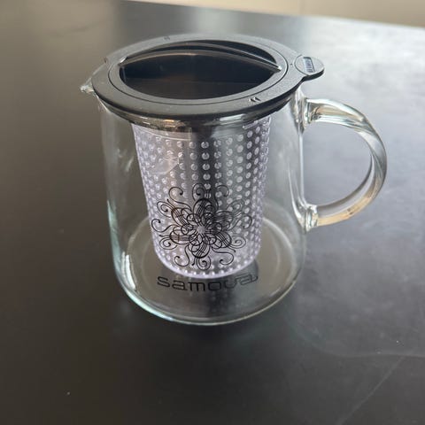 I den matte toppen i rustfritt stål er det integrert et filter og en beholder, slik at teen kan brygges.