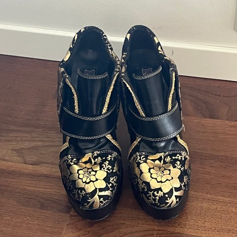 Iron Fist sko med 12 cm høy stiletthæl. "Savage Skull" er hovesdakelig blå, med detaljer i svart, rosa og hvitt. Knallrosa såle, glitrende strass rundt "øynene". Skoene er kun prøvd på innendørs, men de er for små for meg og ønsker derfor ny eier. Størrelse US 6, europeisk 37.