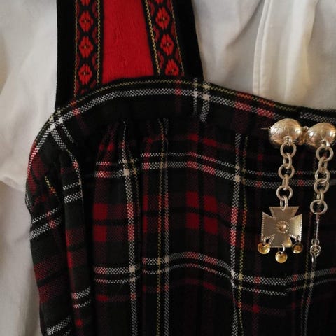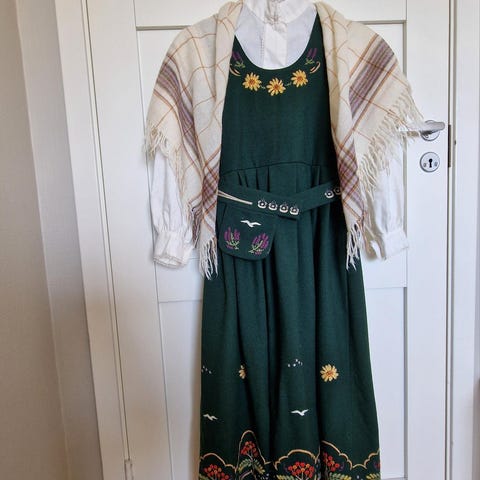 Følger med skjorte, underskjørt, pannebånd, belte og sølv.