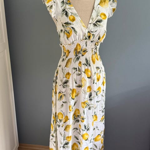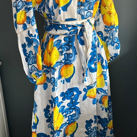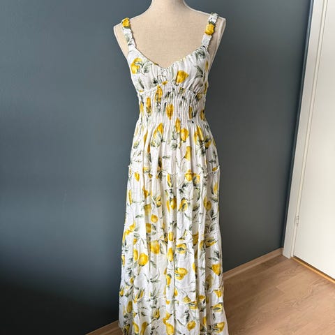 Selger min helt ubrukte Luisa Positano-kjole i fargen gold lace ✨ jeg vil si at den er hvit i bunnen med gulltråd sydd i blondene som får kjolen til å se beige ut.